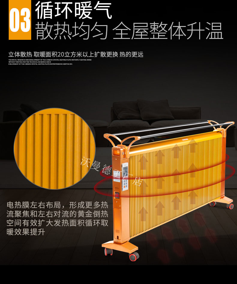 碳晶原子以“布朗運(yùn)動(dòng)”原理為基礎(chǔ)通過(guò)遠(yuǎn)紅外制熱,熱轉(zhuǎn)換率可達(dá)99.8%。,全面散熱,比普通的電暖器熱量提高1倍,帶萬(wàn)向輪底座,膨脹螺絲,壁掛,移動(dòng),方便好用,讓室內(nèi)不在干燥。